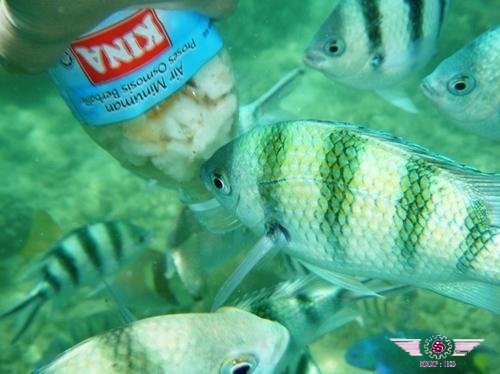 马努干岛的栈桥下聚集了很多鱼,水浅处刚过腰,就能看到很多鱼,不用浮潜,很适合老人和怕水的人。喂鱼的绝招是在矿泉水瓶里塞面包,切片面包的话,撕成条,一瓶装2片就够了。先丢一些面包在水里,然后盖上瓶子,此时瓶子有如魔法棒一般,引来鱼儿的追随,你往哪里游,成群的鱼就跟着你游,直到水更浅些,鱼会聪明地回头。也可以往装着面包的瓶里装水,只向水里倒水,让面包留在瓶里,这样反复,一瓶面包可以喂很久,多享受会儿被鱼儿包围的乐趣。再往深处游些,可看到大一些,品种多一些,色彩更好看些的鱼。马努干岛的栈桥很长,走在栈桥上就能看鱼,水很清。